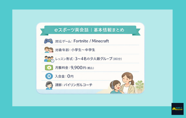 | eスポーツ英会話 | 9,900円〜 | Fortnite / マイクラ他 | 実績30万回・大学との共同研究あり。英語を「使う力」を伸ばしたい子向け |